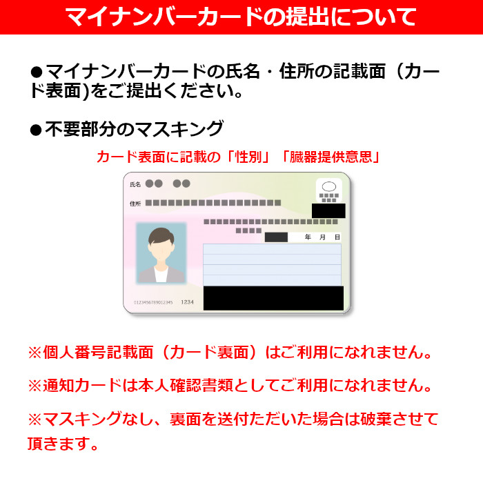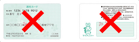 マイナンバーが記載された紙製の「通知カード」は、マイナンバーとともに 氏名、住所、生年月日及び性別が記載されておりますが、 本来、マイナンバーの本人への通知及びマイナンバーの確認のために発行されるものです。したがって、レンタルショップ等での一般的な本人確認の場面では、 通知カードを本人確認書類(身分証明書)として使用することはできません。